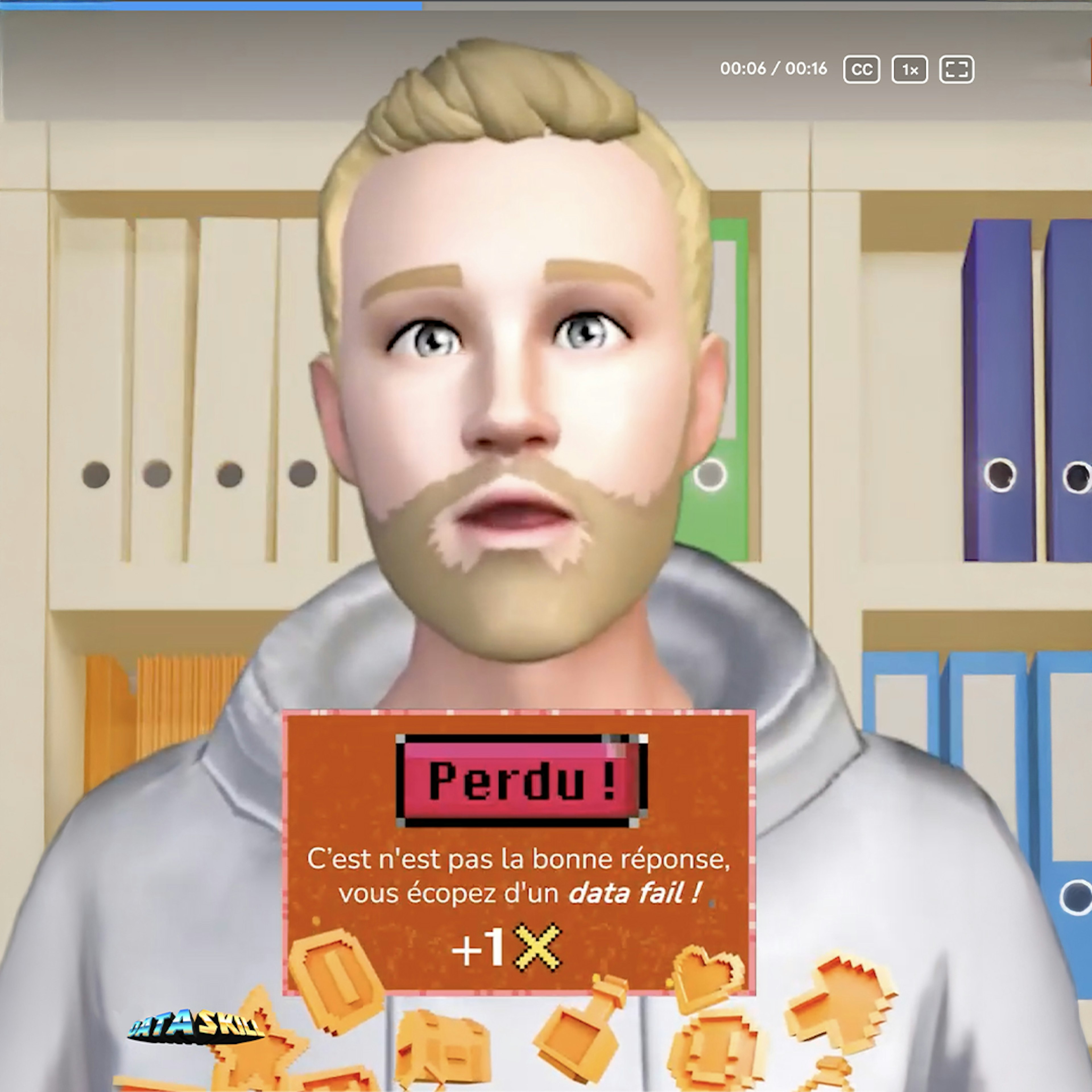 Complete branding around the DataSkill project, including a 3D logo and visual assets for every stage of the game (positive/negative responses, feedback screens, etc.).