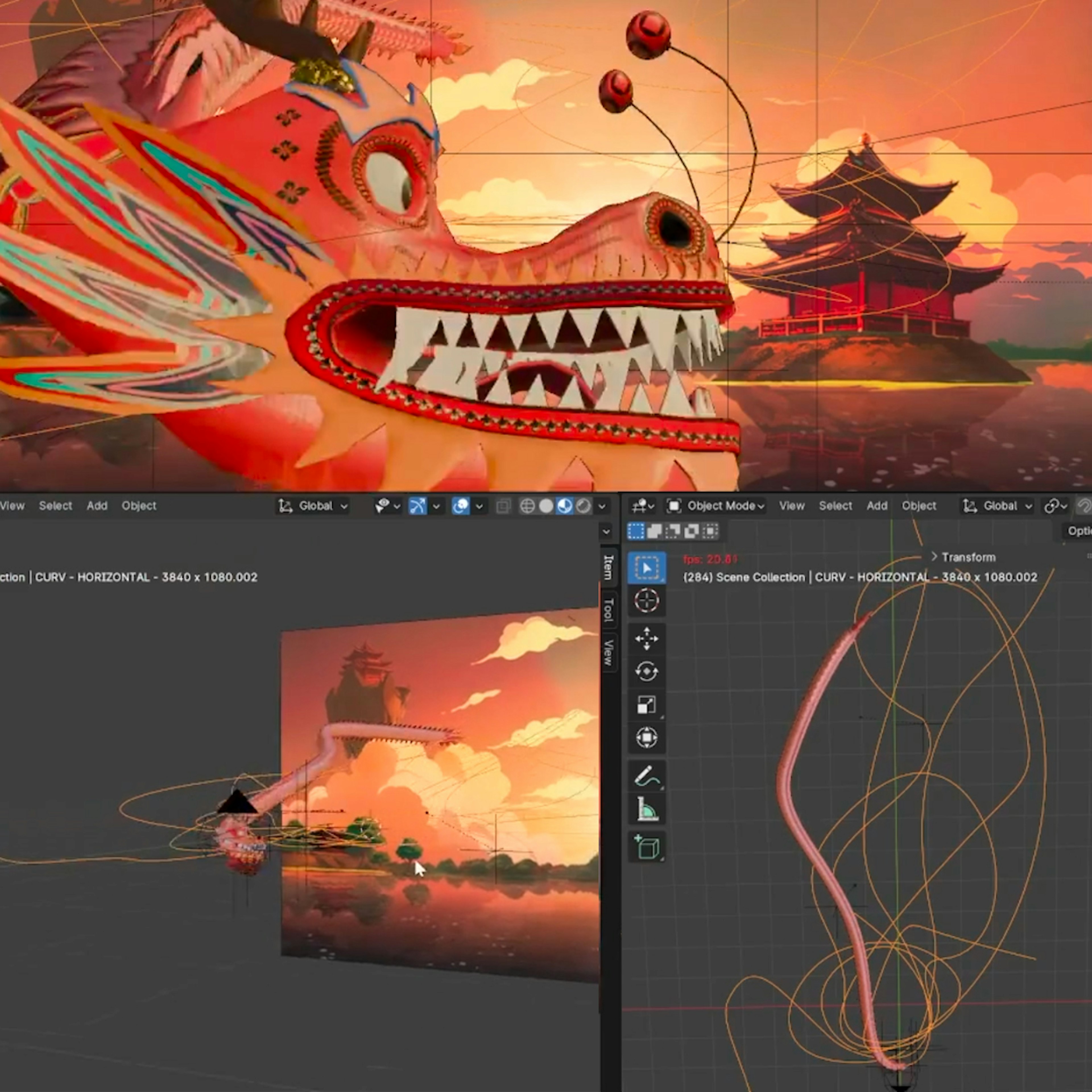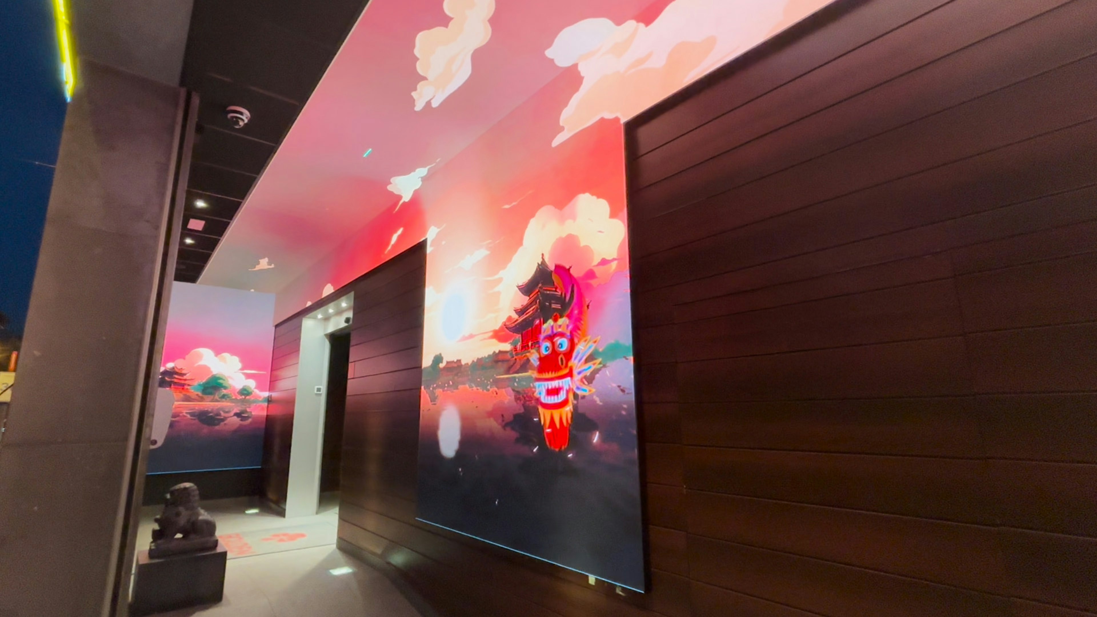 We designed an animation where a majestic dragon soars and weaves across multiple screens, seamlessly integrated into the environment, without any distortion from screen angles or formats. This required an extensive R&D phase to perfectly synchronize content within a 3D space.